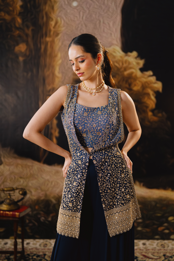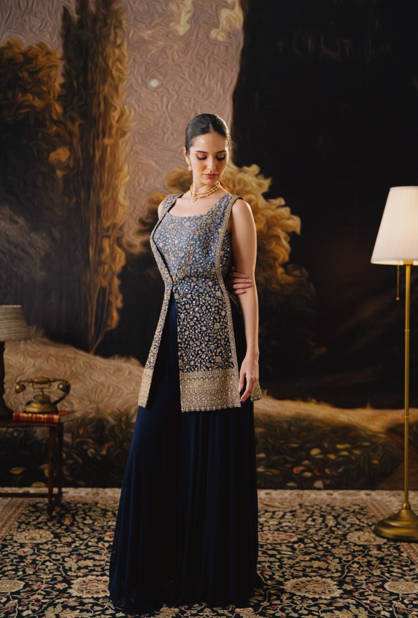 A timeless navy ensemble that blends grace with statement sophistication. This features a beautifully hand-embroidered long jacket layered over a structured embroidered bustier and fluid flared bottoms. The gold zari detailing adds regal depth, making it perfect for evening weddings, cocktail soirées, and festive gatherings. It’s classic, flattering, and effortlessly refined.