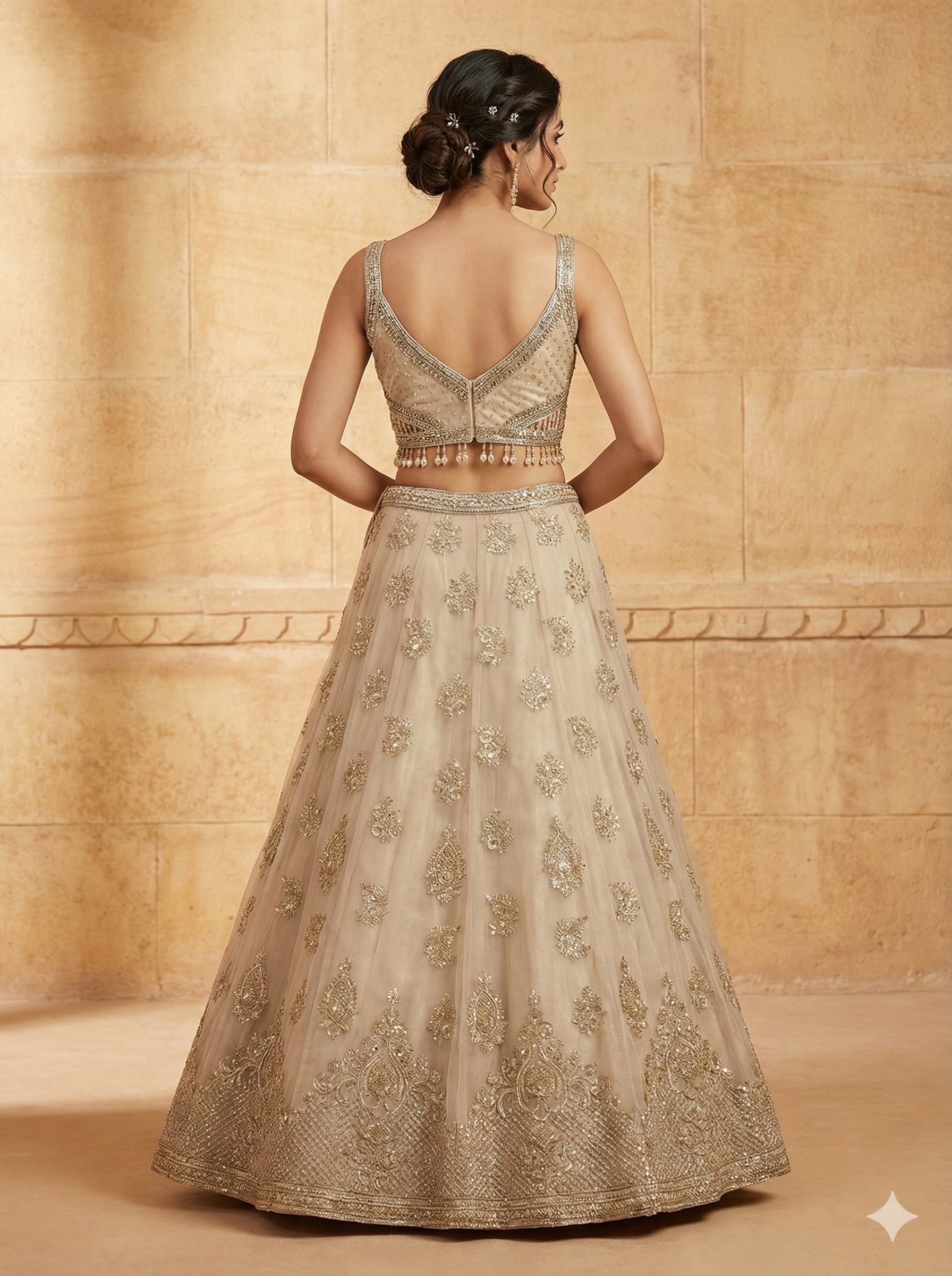 Radiate ethereal beauty in this champagne gold lehenga, meticulously crafted from layers of fine tulle. The set features a sweetheart-neckline blouse adorned with dense gold zari and a delicate beaded fringe hem. The voluminous skirt is covered in intricate floral buttis and finished with a heavy, scalloped metallic border, while a matching sheer dupatta with gold embroidery completes this regal, high-shine silhouette.