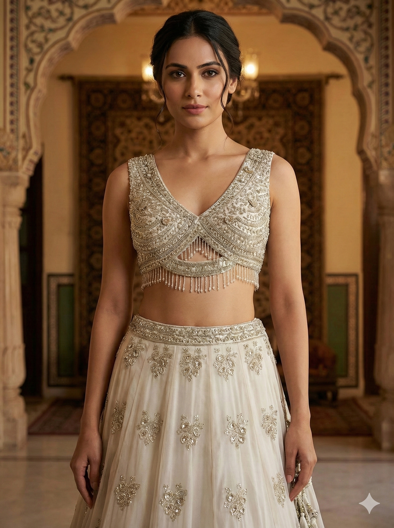 Radiate timeless elegance in this ivory lehenga set, featuring a structured V-neck sleeveless blouse with intricate gold zari work and a delicate beaded fringe hem. The voluminous tulle skirt is adorned with majestic gold floral buttis and a heavy scalloped border, creating a regal silhouette. This ensemble is a masterclass in understated luxury, perfect for a sophisticated bridal look or high-end festive event.