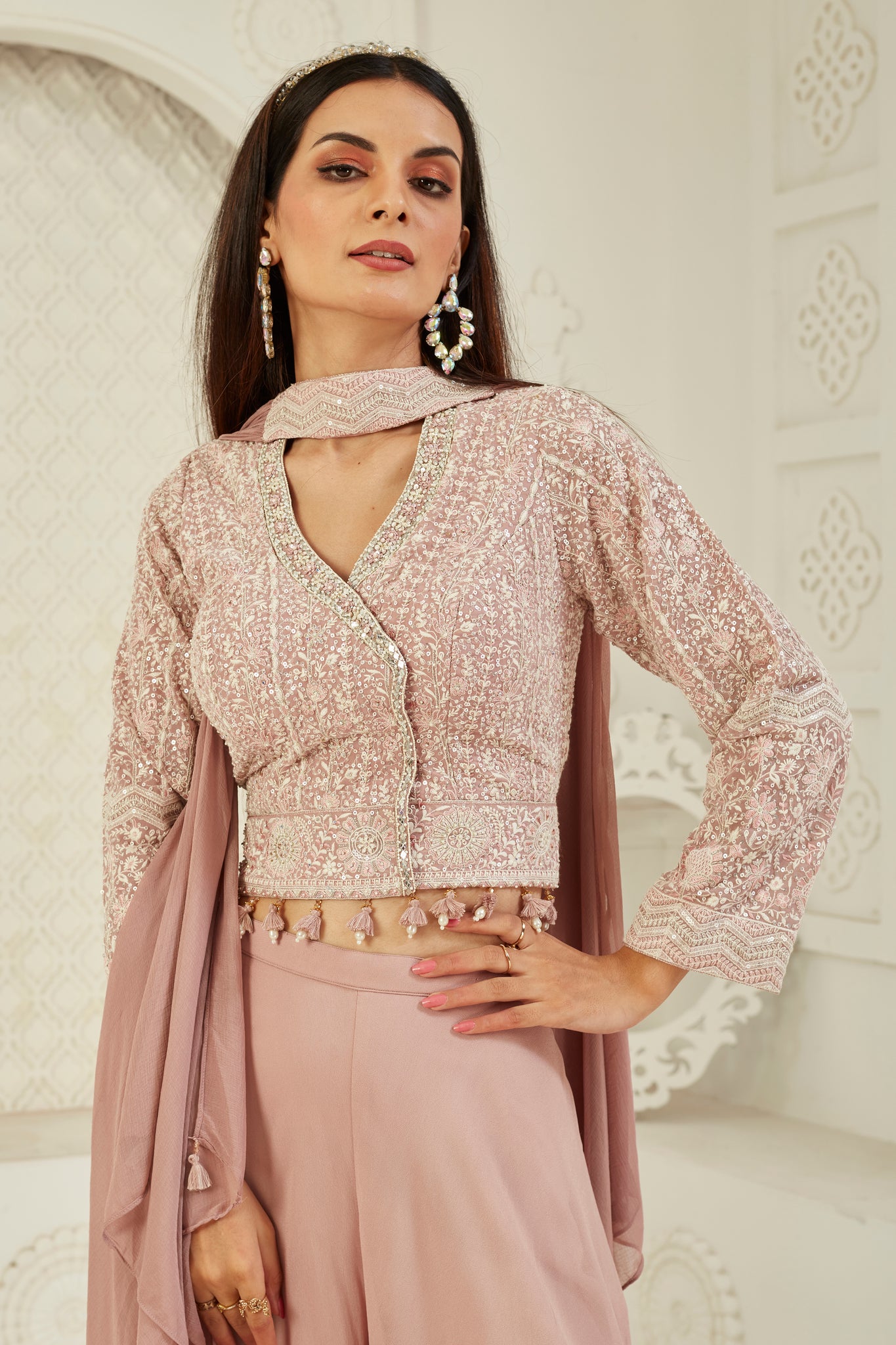 A vision of elegance, this pastel pink sharara set features flowy pants and a long embroidered blouse with a flattering V-neckline and delicate tassel detailing. Paired with a matching embroidered dupatta, this look blends classic charm with modern finesse—perfect for intimate weddings, mehendis, or festive luncheons.