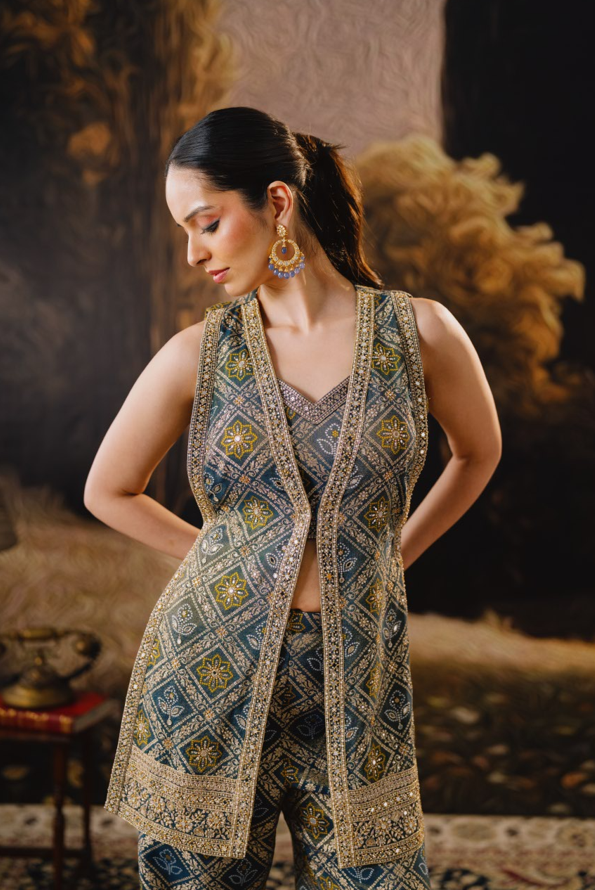 A contemporary and regal three-piece ensemble in rich blue and antique gold. It includes a bustier-style crop top and wide-leg trousers, overlaid with a long sleeveless jacket, all featuring a distinct geometric/brocade pattern embellished with fine thread and beadwork. This structured set offers a powerful, glamorous look, ideal for evening receptions or formal festive gatherings.